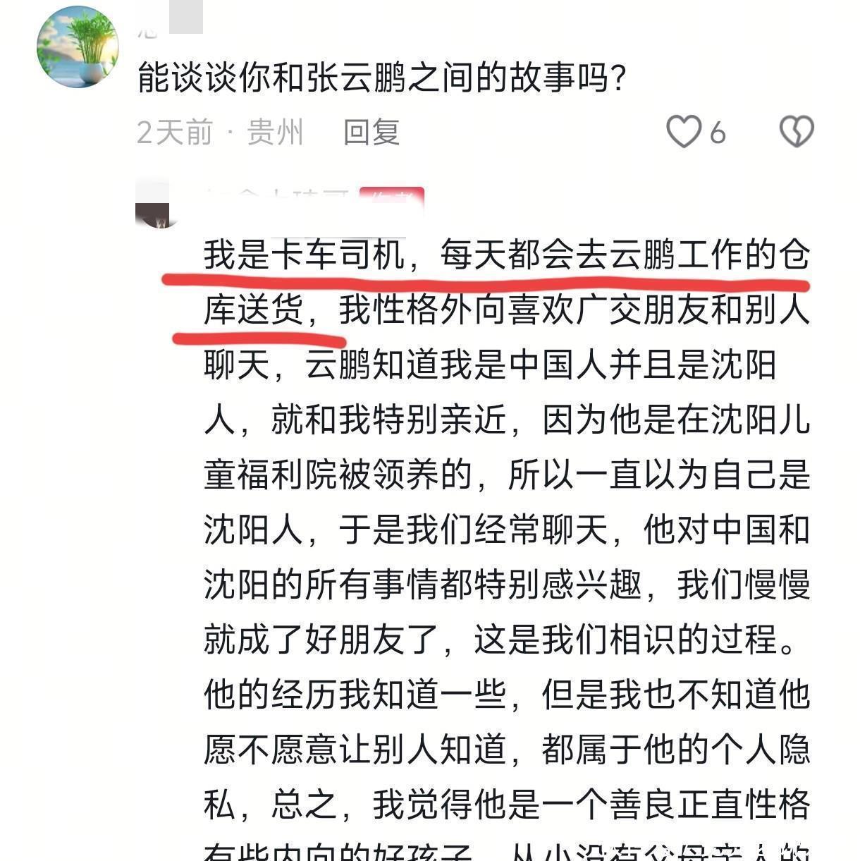 那位大哥在加拿大搞卡车司机的职业,每天都跑到张云鹏工作的仓库送货。他性格挺开朗,挺喜欢结交新朋友的。张云鹏得知这位司机大哥是沈阳人后,感觉挺亲切的,慢慢地,两人关系变得越来越熟悉,成了无话不谈的好伙伴。